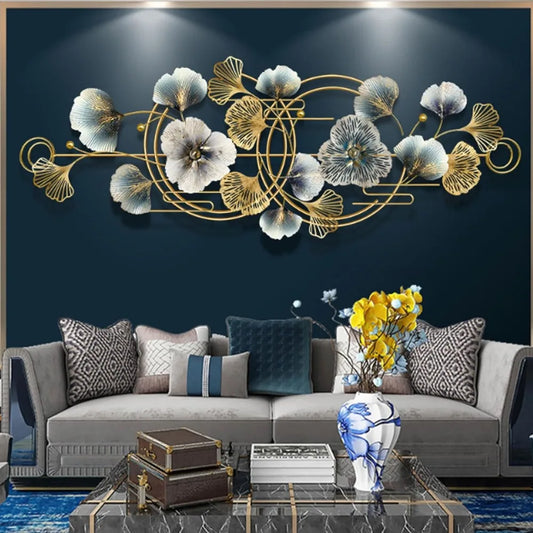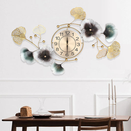 Modern Large Metal Gold-Green Ginkgo Leaf Wall Clock, Quartz Movement