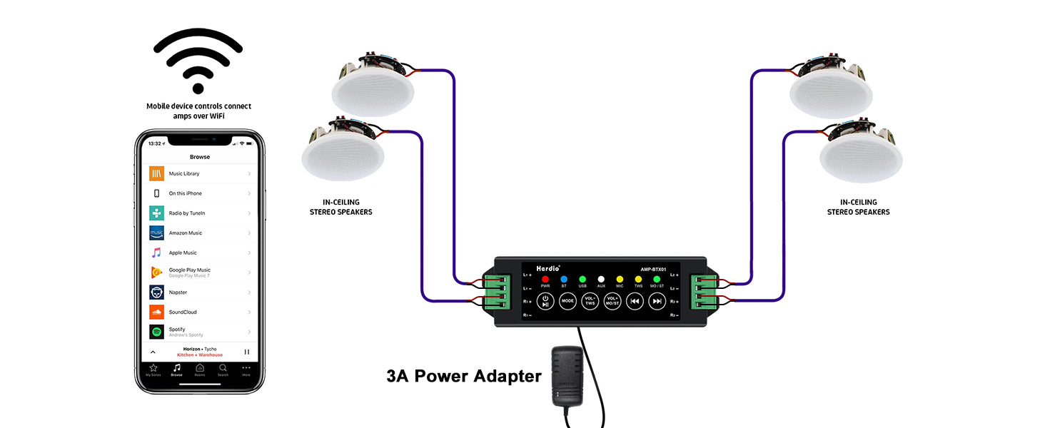 Included Components: 4* 4 Inch Ceiling Speaker, 4* Speaker Cable, 1* Wall Amplifier, 1* Power Adapter (Supplied by your country), 1* Manual